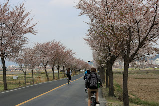 We biked for about 20 km on Saturday and it was pretty magnificent. We had a specific route planned but I think we strayed a little and got both lost and found. Most of the roads we went down were lined with blossoms, or winding through parks or overlooking spectacular views. It was amazing. We stopped in a little family run joint for soup to refuel for the afternoon and off we went again. The sky was blue, the air was fresh and everywhere you looked spring was bursting out of it's shell. There were some uphills that made me want to be laying flat back down on the hard jimjilbang floor but other than that it was a great day.